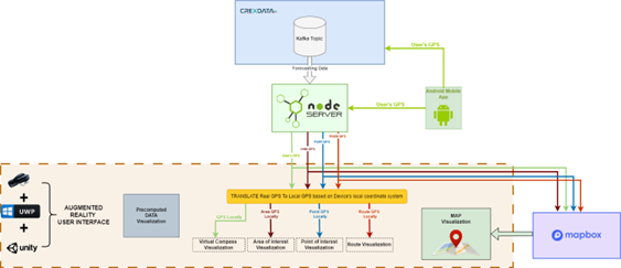 - Outdoor Localization: To solve the challenge of precise outdoor positioning for AR, the project developed a companion Android application. This app acts as a high-precision GPS provider, streaming location data to the headset via a local Wi-Fi or 5G hotspot.