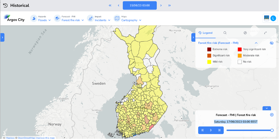 FMI Forest fire model simulation view 15-17.6.2023 in ARGOS.