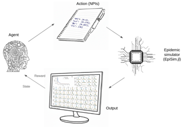 A framework that integrates EpiSim.jl with reinforcement learning techniques. It trains a Q-learning agent to identify optimal strategies for dynamic non-pharmaceutical interventions strategies, such as confinement and mobility reduction policies.